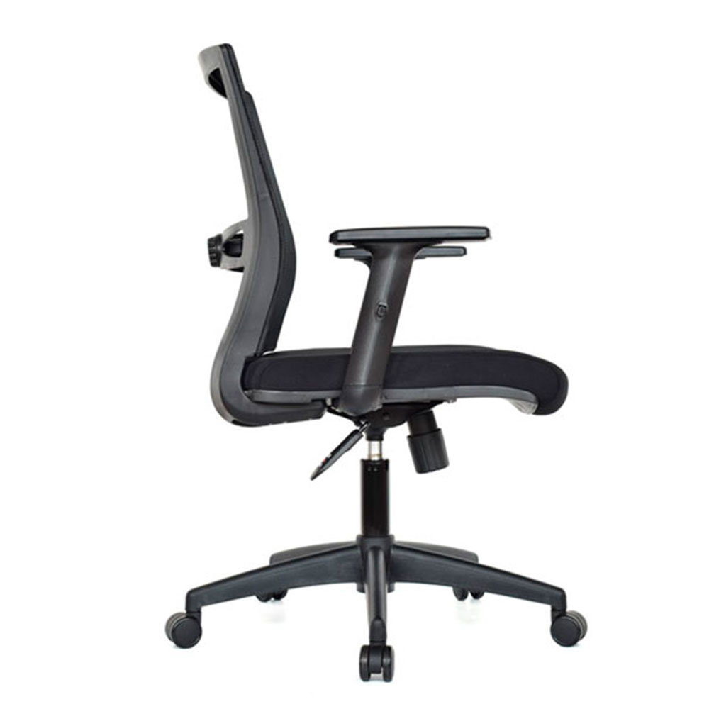 El cilindro neumático de acero negro ajusta la altura del asiento mediante elevación de gas con un solo toque, permitiendo que tus pies queden planos y la espalda bien apoyada para evitar tensiones acumuladas. Su mecanismo basculante con 1 bloqueo fija la inclinación en posición segura para pausas cortas, manteniendo el control total. El asiento en espuma laminada tapizado en tela negra brinda un acolchado uniforme y duradero que resiste el uso diario, mientras el espaldar forrado en malla antitranspirante de alta resistencia permite que el aire circule libremente, evitando calor y sudor en la espalda durante horas. Los brazos graduables en altura con pad en nylon dan soporte ajustable a los codos, reduciendo carga en hombros, y el apoyo lumbar fijo proporciona un respaldo constante en la zona baja para promover postura natural. En negro integral, la KATA es la silla gerente con malla sencilla y robusta que une comodidad básica, ventilación diaria y funcionalidad probada en oficinas prácticas y eficientes.