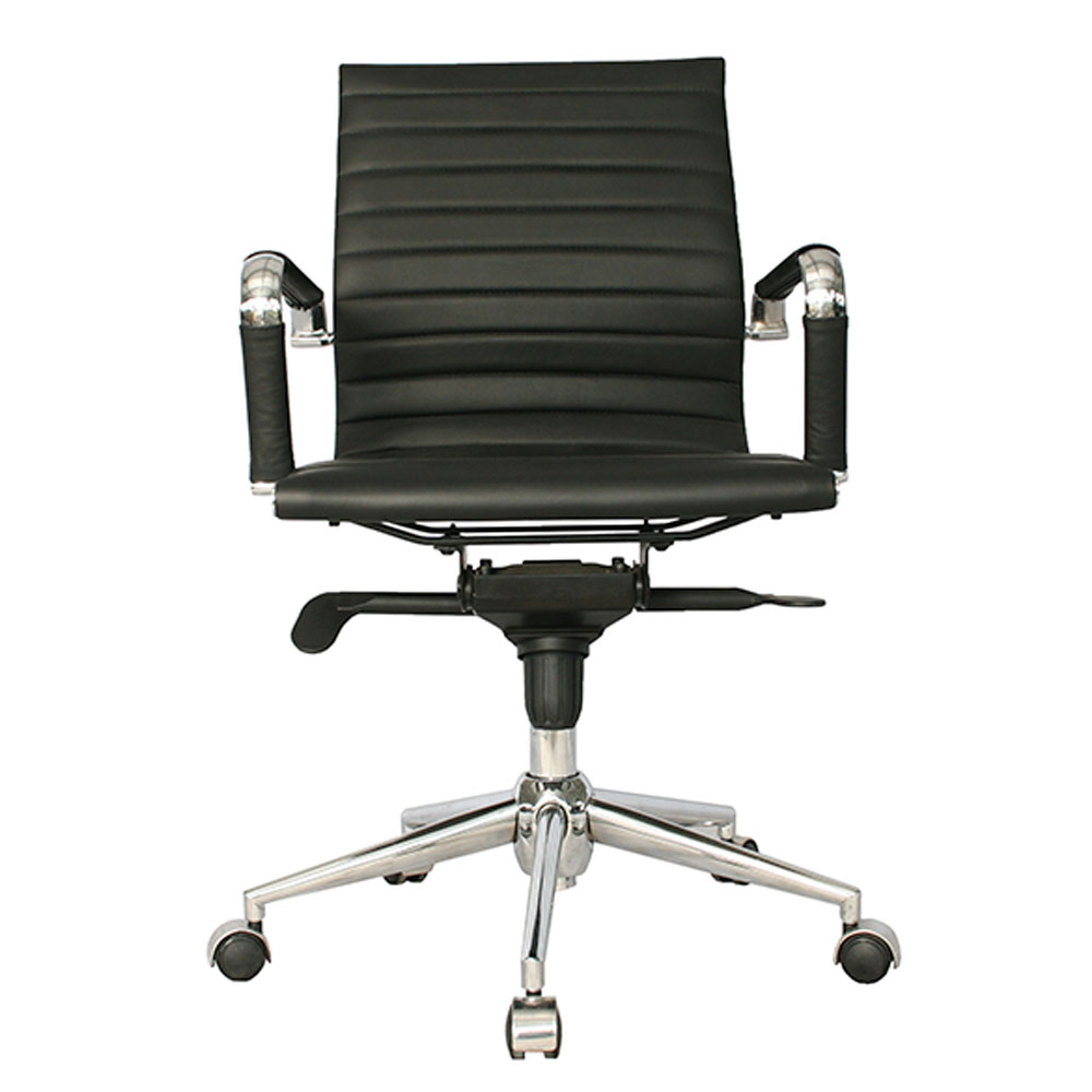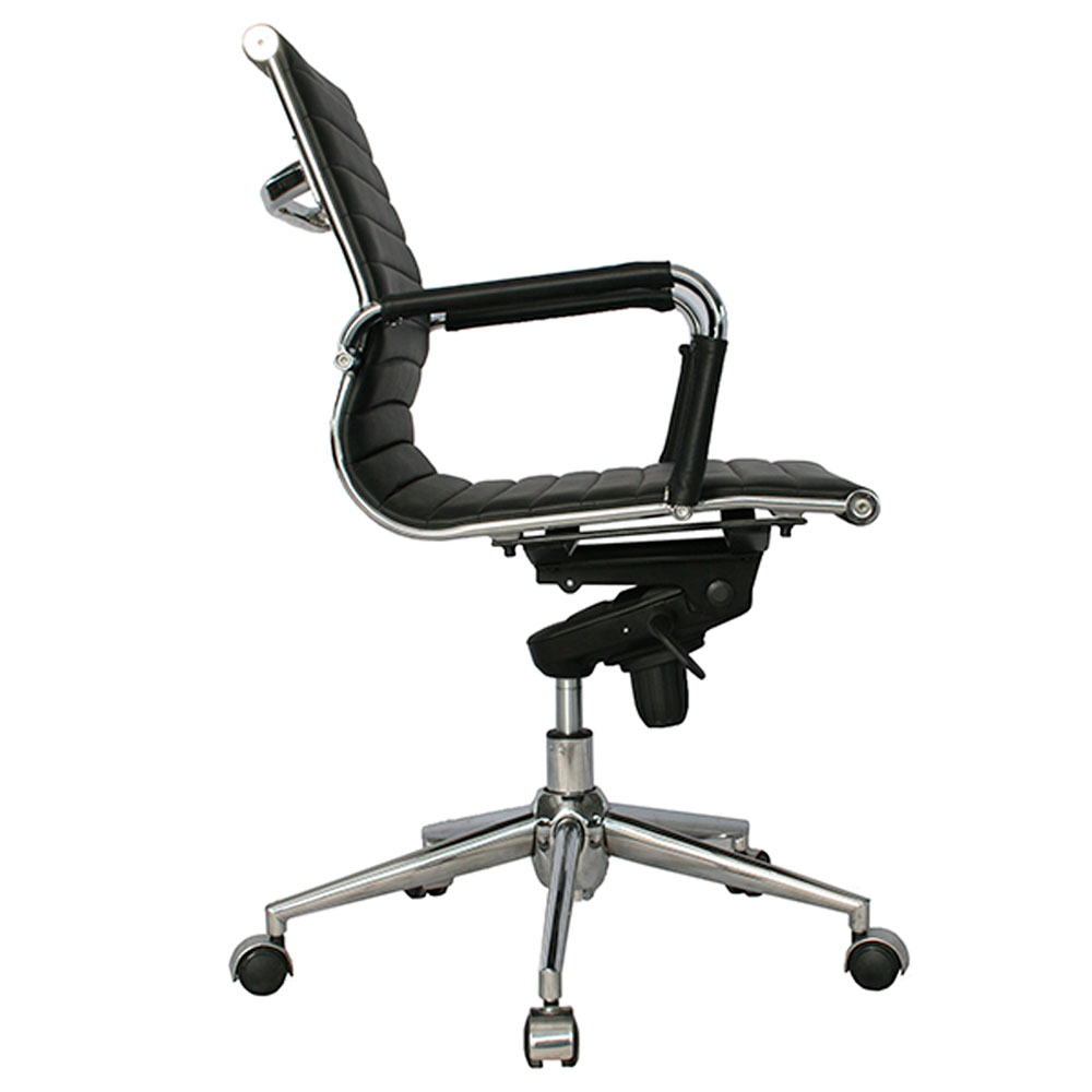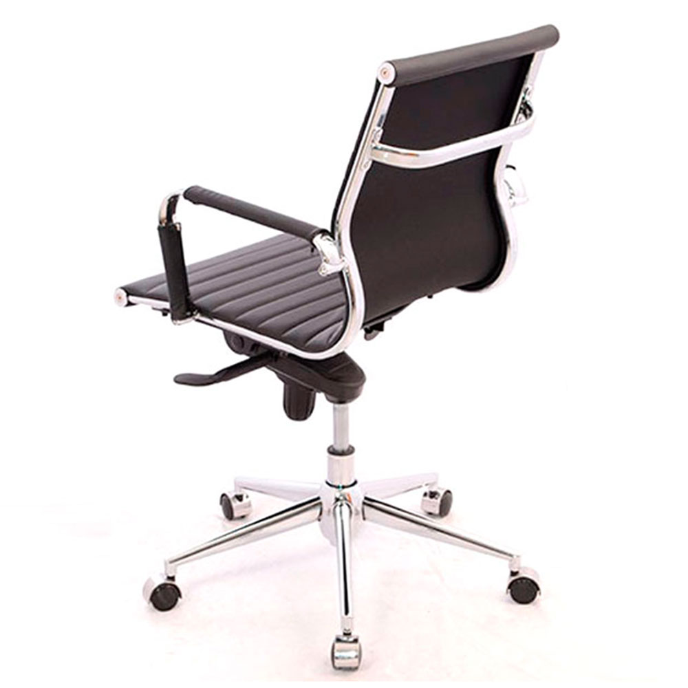 Su mecanismo syncro avanzado con 4 bloqueos sincroniza asiento y respaldo en ratio 1:2.5, fijando posiciones exactas para trabajo, lectura o reclinación, complementado por función basculante que permite movimiento libre cuando se desactiva. La estructura metálica con acabado en cromo —tanto en base como en cuerpo— garantiza durabilidad clase 4 y resistencia a la corrosión, mientras los brazos cromados fijos brindan soporte firme y elegante a codos y antebrazos. Todo tapizado en cuero sintético negro de alta calidad ofrece textura lujosa, fácil limpieza y resistencia al desgaste diario, simulando cuero genuino con mayor practicidad. En negro integral con detalles cromados, la POLONIA es la silla gerente syncro con cuero sintético y aluminio polichado que une ingeniería avanzada, confort prolongado y estética impecable en la opción definitiva para oficinas de dirección.