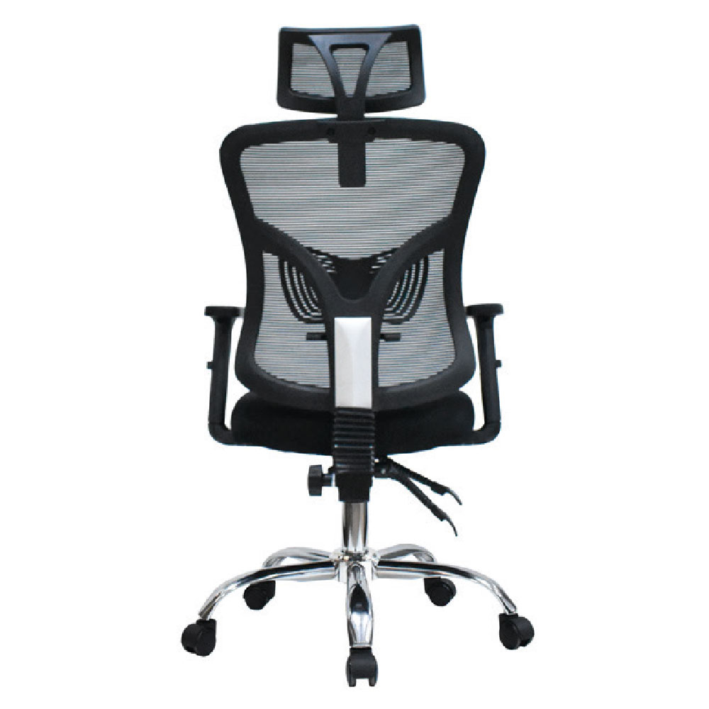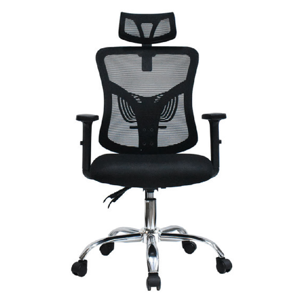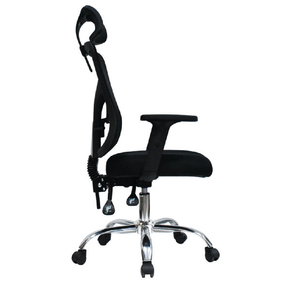 El espaldar en malla graduable en altura cuenta con un apoyo lumbar plástico graduable en altura, mientras que el asiento está equipado con espuma laminada y tapizado en tela de color negro para un confort excepcional durante largas jornadas de trabajo. Finalmente, el cabecero en malla graduable en altura completa esta silla ergonómica y funcional, asegurando una experiencia de trabajo cómoda y productiva para cada usuario.