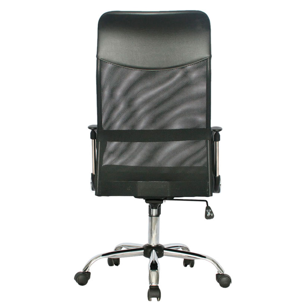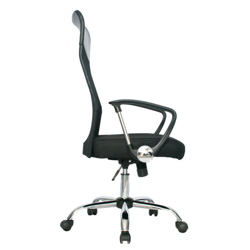 El mecanismo basculante libera movimiento flexible, mientras el espaldar fijo en malla antitranspirante de alta resistencia y asiento en malla promueven ventilación constante y confort prolongado. Brazos fijos en polipropileno con estructura cromada aportan firmeza y elegancia. Ideal como silla presidencial para oficinas que buscan sillas ergonómicas con malla transpirable, basculante simple, base cromada, brazos fijos premium y profesionalismo en negro puro.