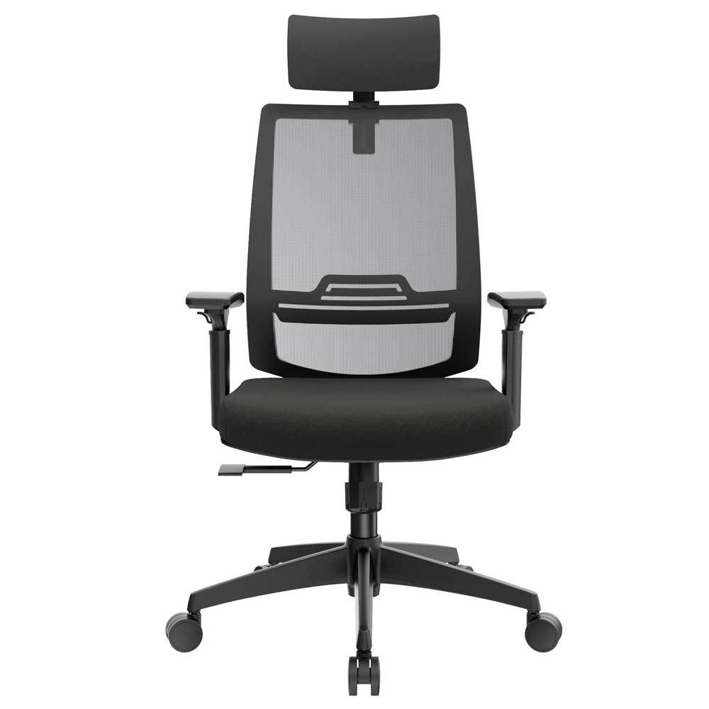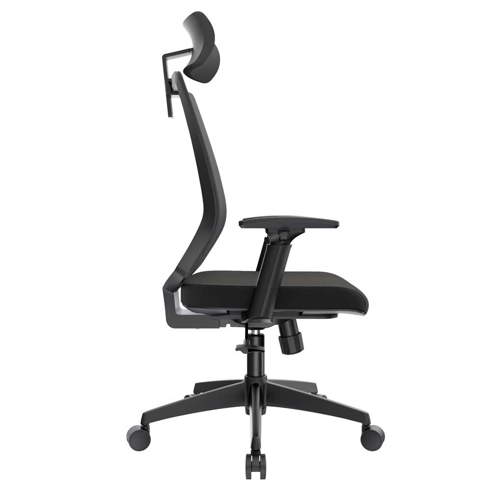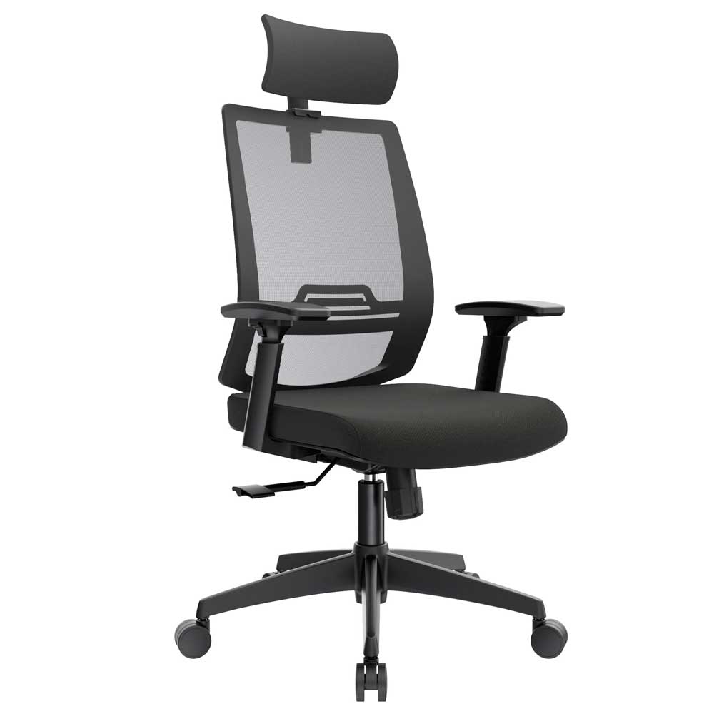 El mecanismo syncro avanzado de 3 bloqueos sincroniza asiento cascada en espuma inyectada densidad 60 kg/m³ tapizado en paño con opción slider 6 cm y espaldar alto en malla nylon transpirable regulable 7,5 cm en altura. Estructura polipropileno con brazos 3D opcionales (altura, profundidad 5,5 cm, ángulo) y cabecero tapizado regulable en altura completan esta armonía postural. Ideal como silla presidencial para oficinas que buscan sillas ergonómicas con syncro 3 bloqueos, malla regulable, slider precisión, brazos 3D y bases versátiles para distinción y salud en negro/gris.